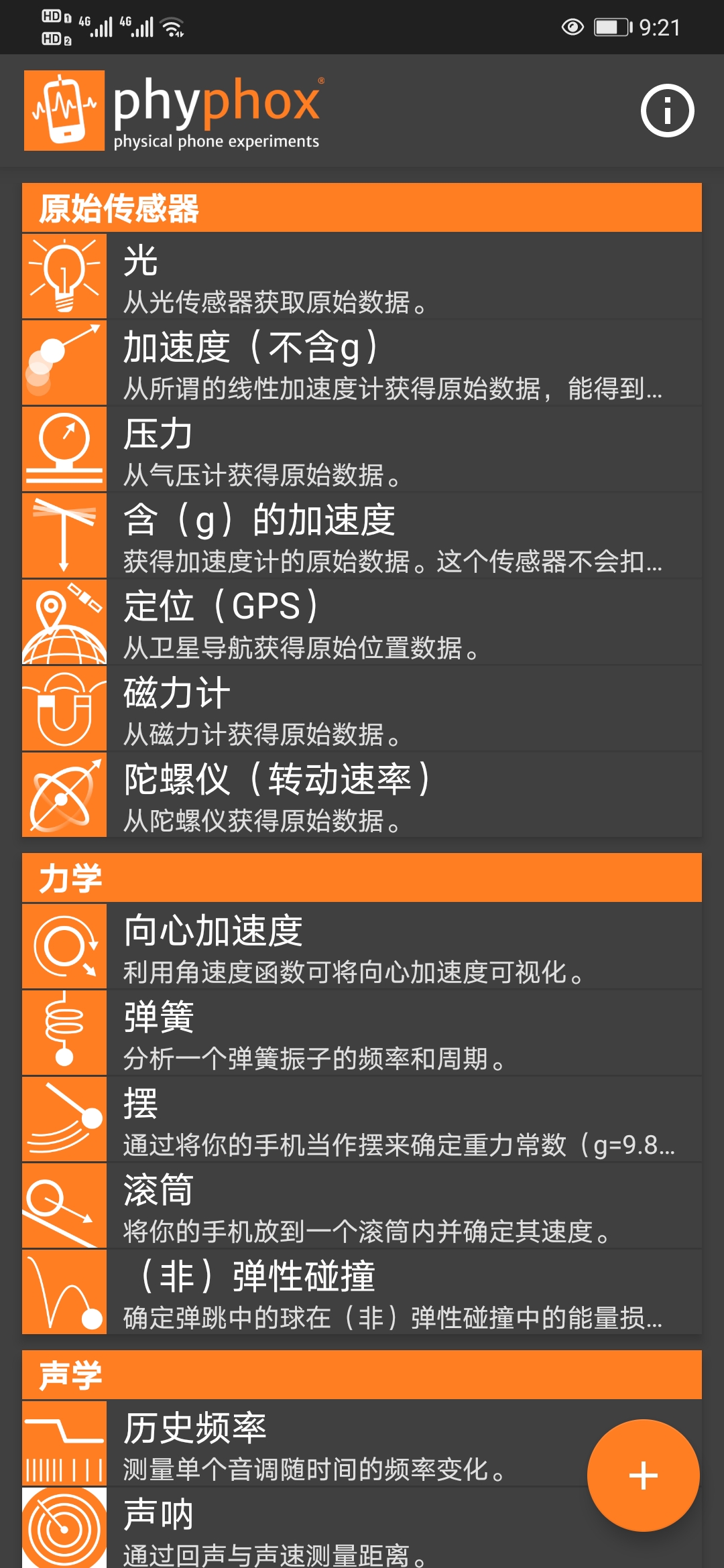 手机上最少集成了20多种传感器,那么应该如何调用这些传感器用于科学实验呢?在手机上有一款传感器软件phyphox, 通过手机应用市场就可以下载。 它是一款专门针对物理学实验打造的移动手机应用,集成了手机上所有的传感器。有了这款应用,你可以立刻把手机变成一台多功能传感器数据采集器。你可以用来实时测量气压、声压、光照、电池、位置、移动网络、WiFi、磁场、重力等数据的变化。