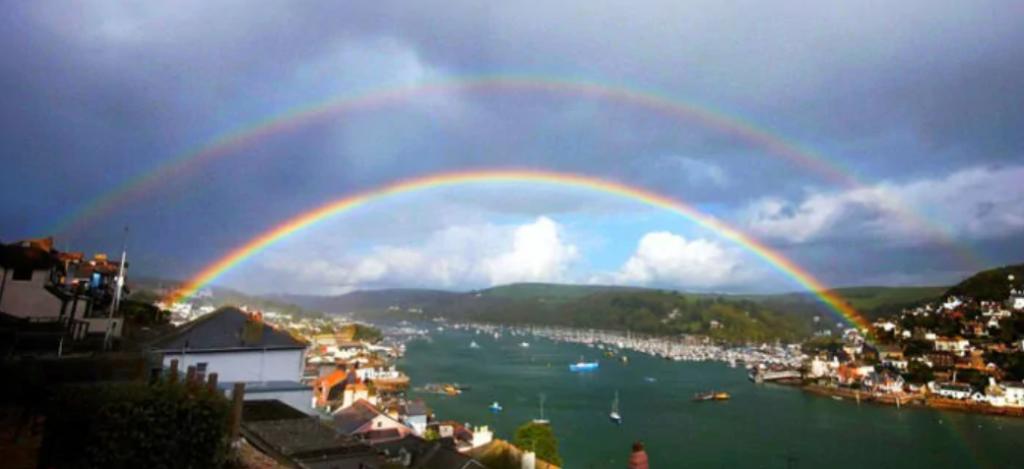 如果你幸运的话,有时还可以观察到双彩虹,其实这是彩虹和霓虹同时出现在天空形成的。彩虹是光线从水滴上部进入,经过两次折射和一次反射形成的;霓虹则是从水滴下部进入,经过两次折射和两次反射形成的,虹和霓形成的高度不一样,颜色的层递顺序也正好反过来。