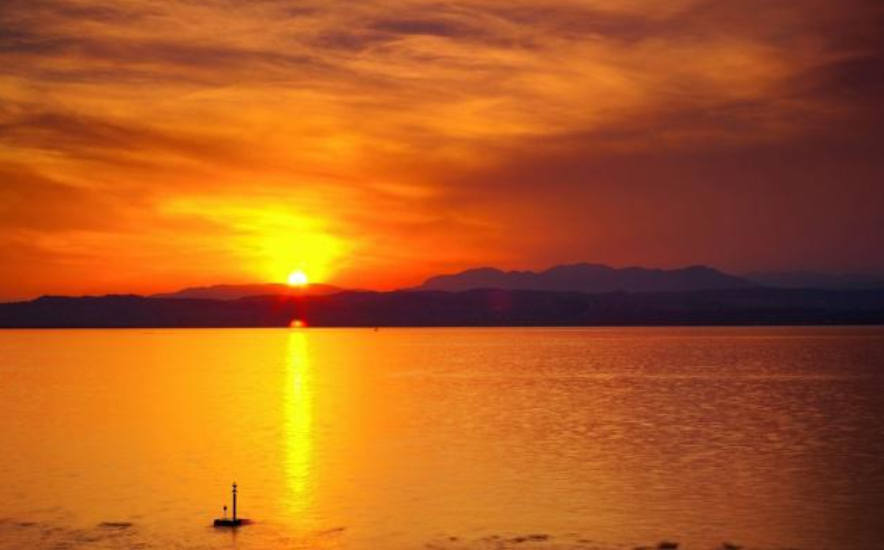 而穿过的距离越长则意味着更多的蓝紫光被散射,于是最后只有偏红的光抵达地面,这就是为什么在早晨或者日落时的太阳呈现出红色,不过值得注意的是,这种红色只在太阳附近出现,而其余更大部分的天空,仍旧显示蓝色或者更暗的颜色。
