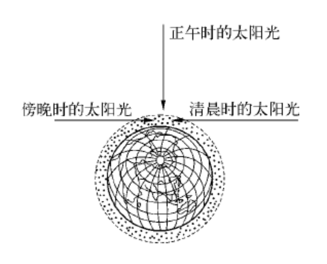 瑞利散射不仅解释了为什么天空呈蓝紫色,而且也能说明为什么朝阳或者日落时的夕阳呈红色。考虑到地球是一个球体,因为包裹地球的大气层可以看做是一个球壳,一般在每天正午左右,太阳位置达到每天的最高点,此时太阳光从大气层穿透到地面上时,经历的大气层厚度是一天当中最短的;而到了日落(或者日出)时,太阳光所经历的大气层厚度是一天当中最长的,如下图。