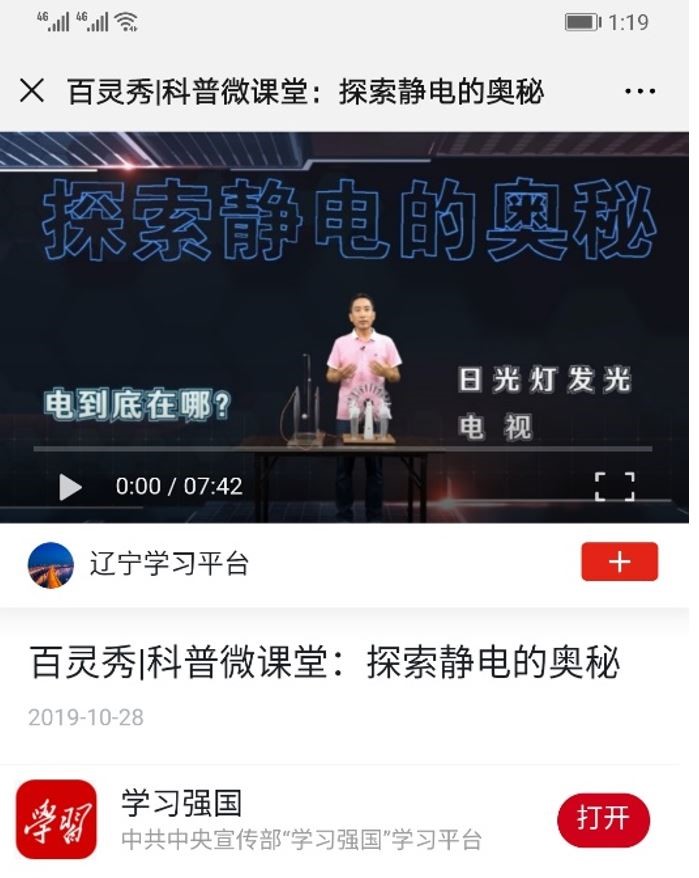 中心教师设计的科普类实验分别在2016年和2019年被湖南卫视《新闻大求真》栏目采纳,该节目在黄金时段播出,并被优酷、腾讯、搜狐和爱奇艺等多家视频网站收录,极大程度上扩大了科普的受众范围。同时,中心设计的静电实验还被中央宣传部“学习强国”采纳,使我们的科普工作进入了越来越多人的视野。