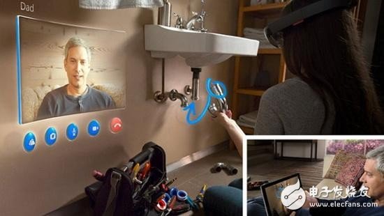 微软在HoloLens的演示中充分展示了目前阶段全息技术在消费领域的价值。由于采用Windows 10核心,可以让开发者更方便地开发全息应用。比如Skype,戴上HoloLens后,女儿可以将父亲的画面投射在墙壁上,而父亲则通过平板绘制指示,知道女儿如何更换水管。而这些虚拟的指示图标,也会生动地映射在眼前。